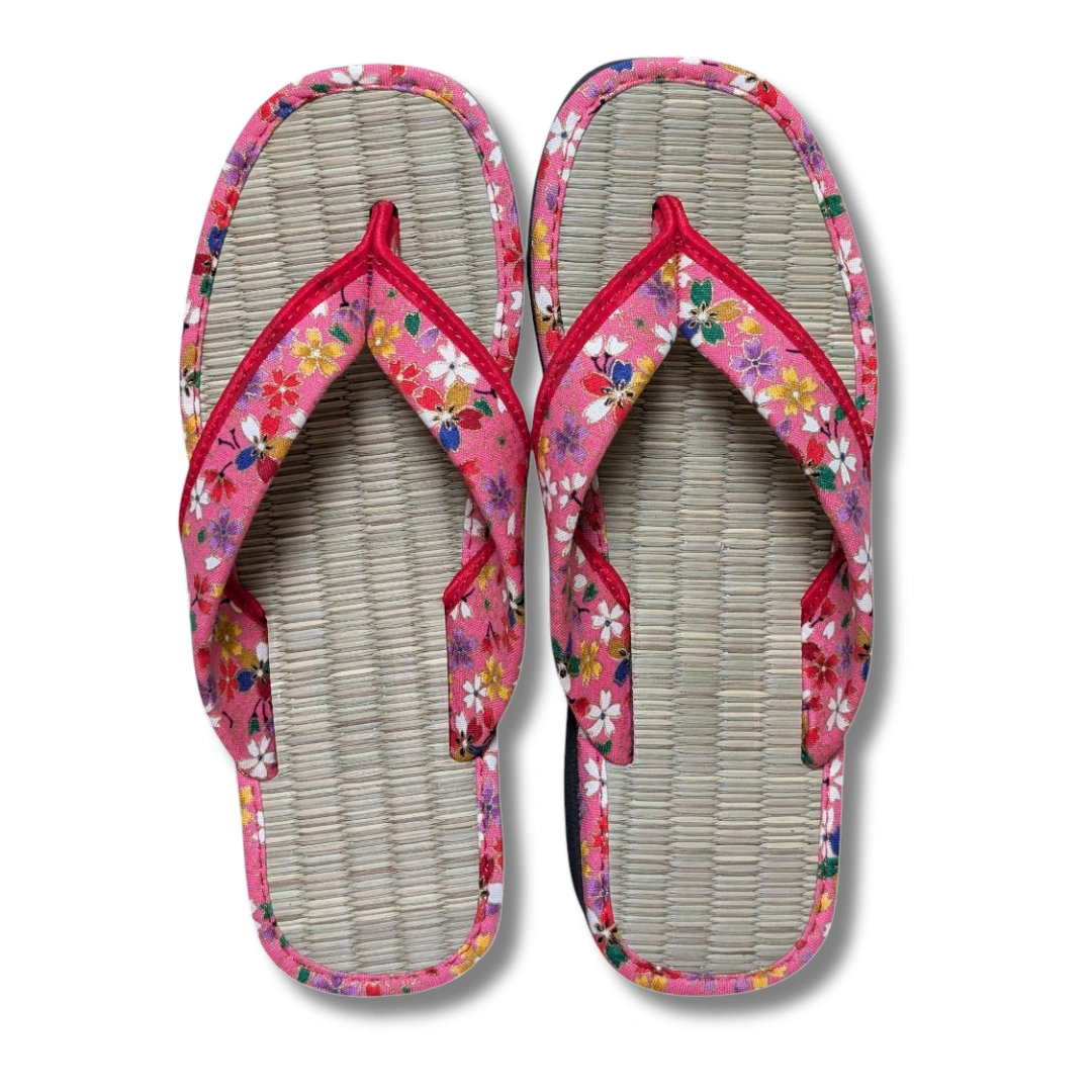 Wunderschöne japanische Zori Flip Flops für Damen! Diese Damen Zori haben ein japanisches Blumen-Muster. Der Grundton ist rosa. Die aus echten japanischen Tatami-Matten hergestellten Schuhe sind geschmeidig und angenehm zu tragen, mit geringer Wärmeentwicklung an den Fußsohlen.