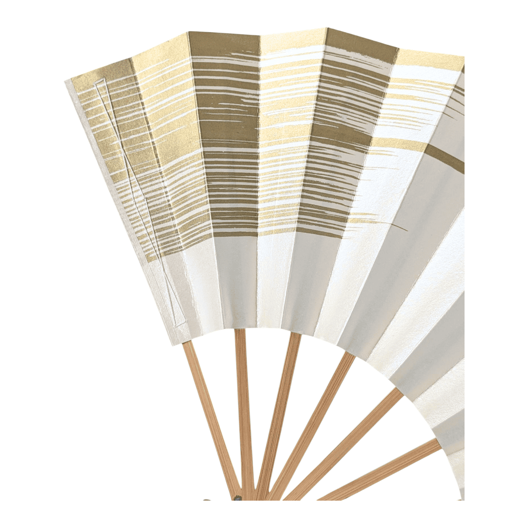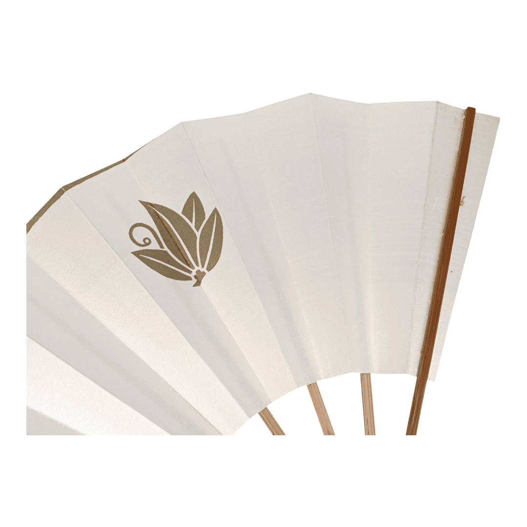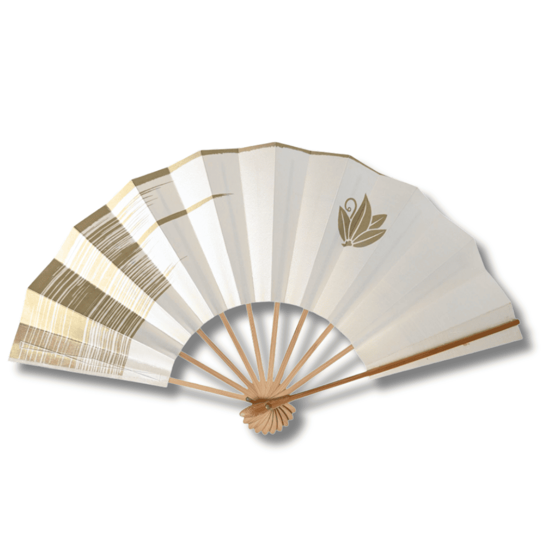 Dieser elegante Sensu-Fächer begeistert durch seine schlichte, naturverbundene Gestaltung. Auf weißem Fächerpapier setzen goldene Akzente mit Pflanzenmotiven harmonische Highlights. Die feinen Linien auf der linken Seite erinnern an japanische Tuschmalerei, während das florale Emblem rechts oben einen ruhigen Kontrapunkt setzt. Der Fächer wird von naturfarbenen Holzstreben getragen. Ideal für traditionelle Auftritte oder als dekoratives Highlight in Deinem Zuhause.
