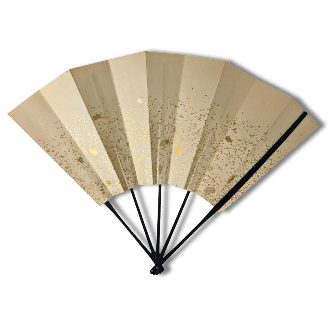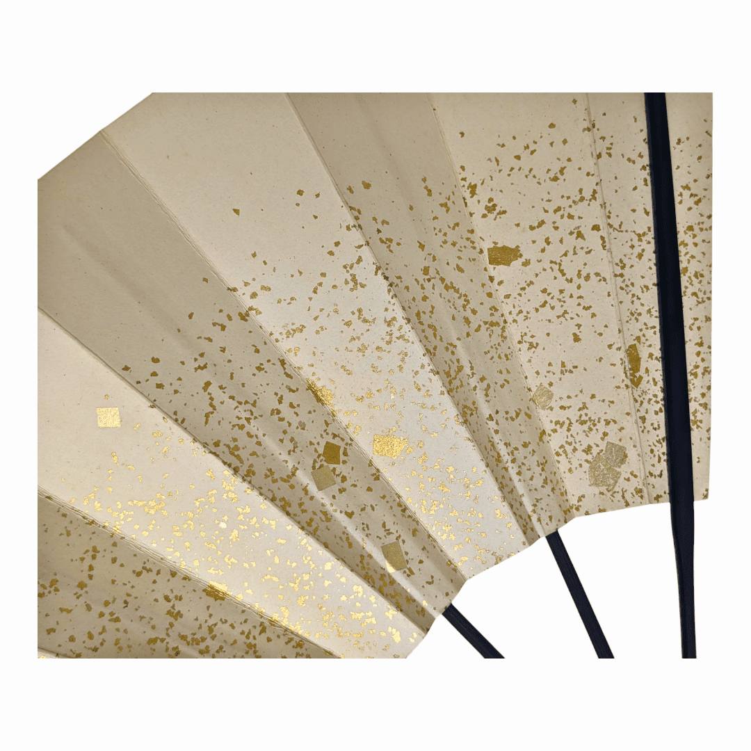 Die Rückseite ist mit goldenen Sprenkeln auf hellem Untergrund verziert und unterstreicht die hochwertige Verarbeitung. Ob als Deko-Objekt, für Auftritte oder als Teil eines Kimono-Outfits – dieser Fächer verbindet traditionelle Ästhetik mit einer starken Präsenz.