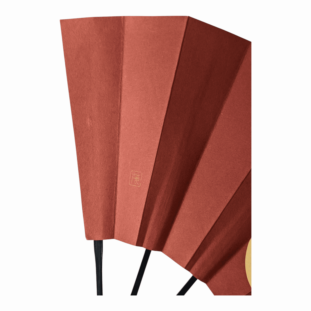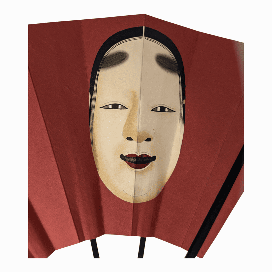 Ein echter Blickfang: Dieser handgefertigte Sensu Fächer zeigt auf rotem Hintergrund das Motiv einer traditionellen Nō-Maske – ein zentrales Symbol der klassischen japanischen Theaterkunst. Die stilisierte Maske in sanften Beige- und Rottönen verleiht dem Fächer eine geheimnisvolle und zugleich elegante Ausstrahlung.