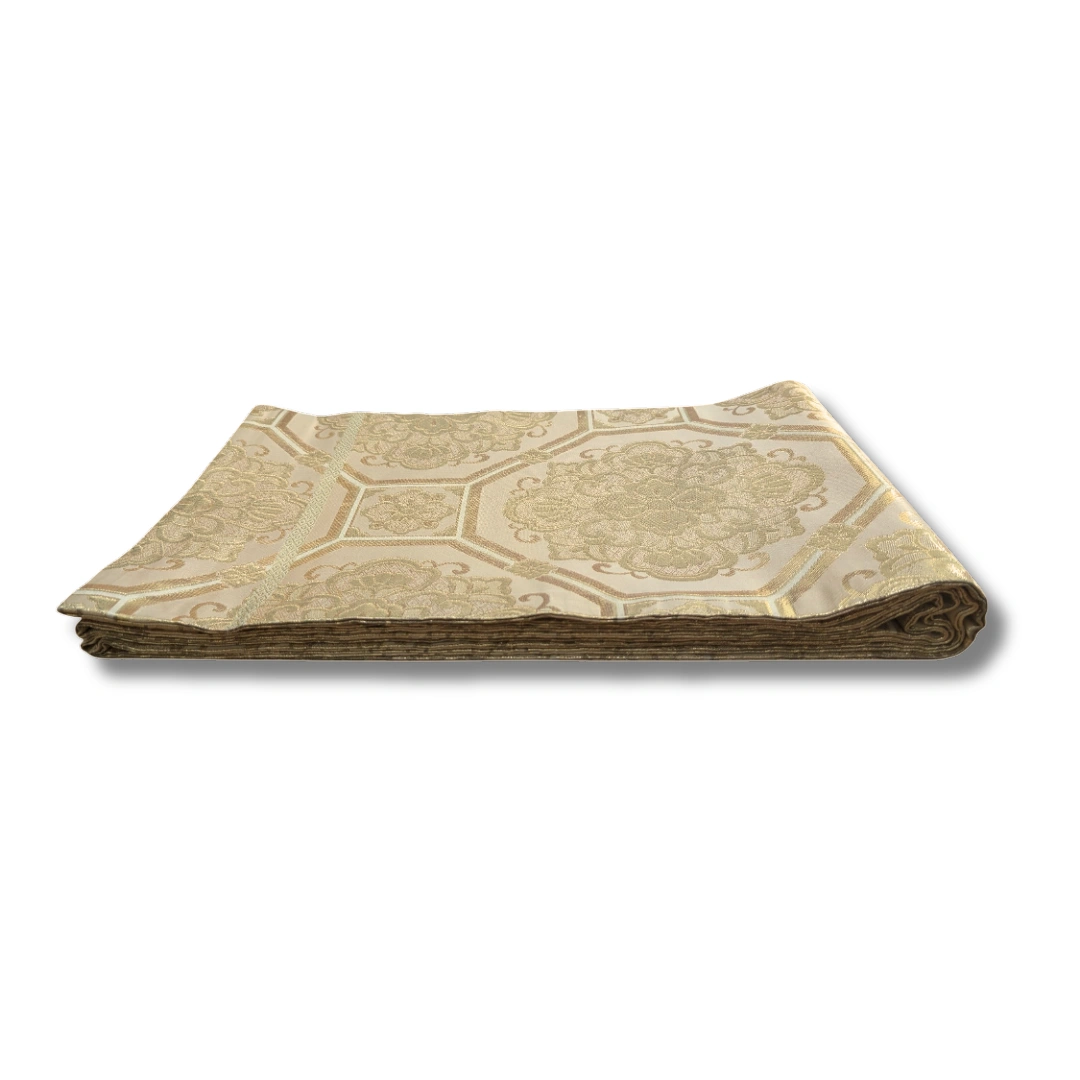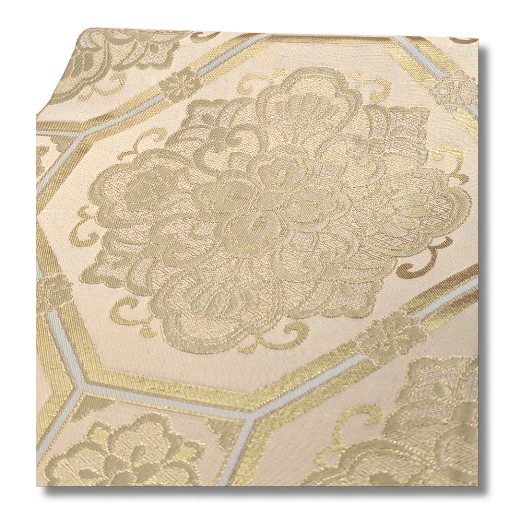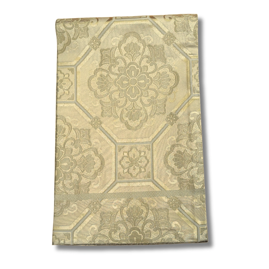 Dieser edle Maru Obi besticht durch sein aufwendiges, traditionelles Webmuster in sanften Goldtönen. Die großflächigen, floralen Ornamente sind von geometrischen Rahmen eingefasst und verleihen dem Obi eine erhabene, fast majestätische Wirkung. Die harmonische Farbgebung in Beige- und Goldnuancen sorgt für einen zeitlosen, eleganten Look, der perfekt zu formellen Anlässen wie Hochzeiten, Teezeremonien oder Bühnenauftritten passt.