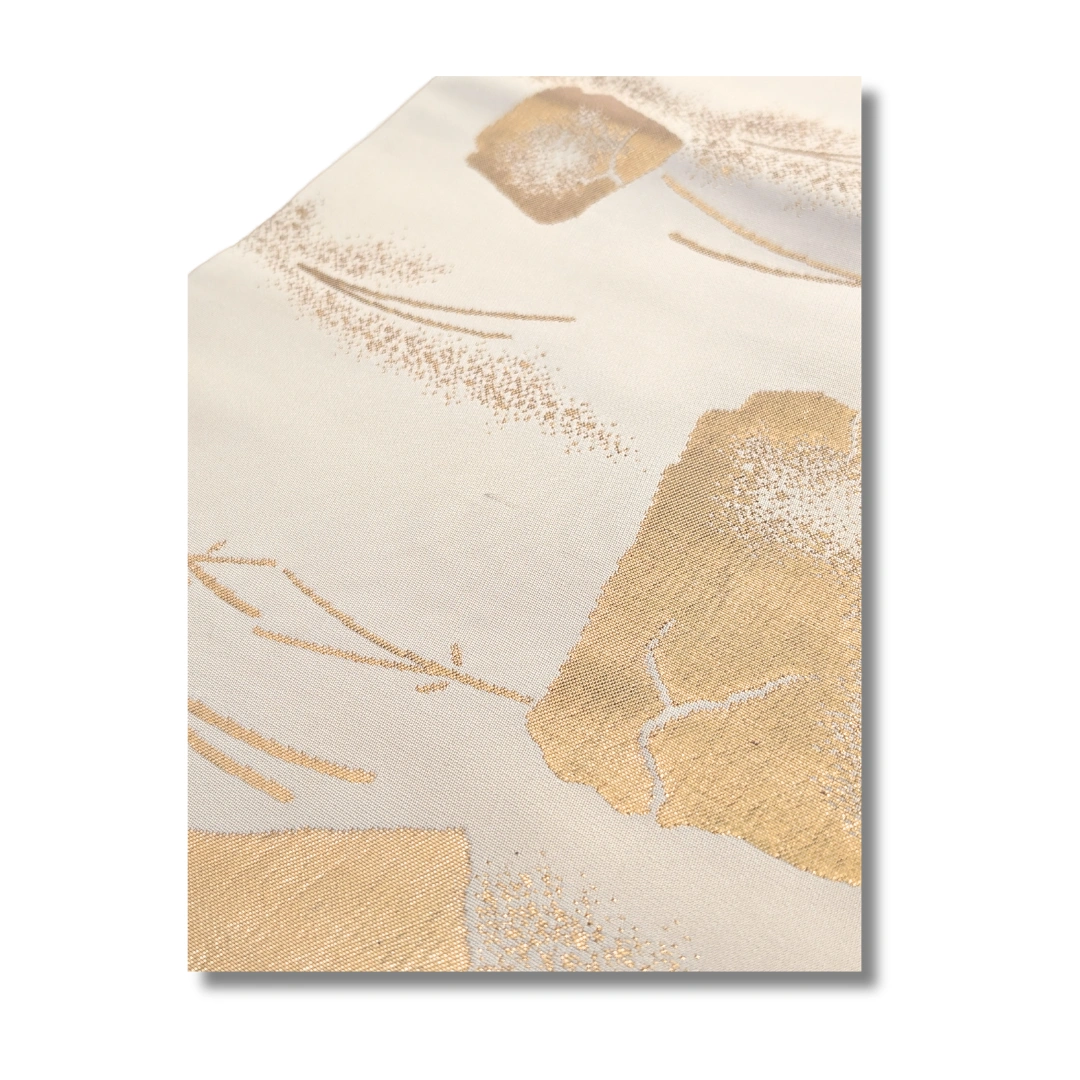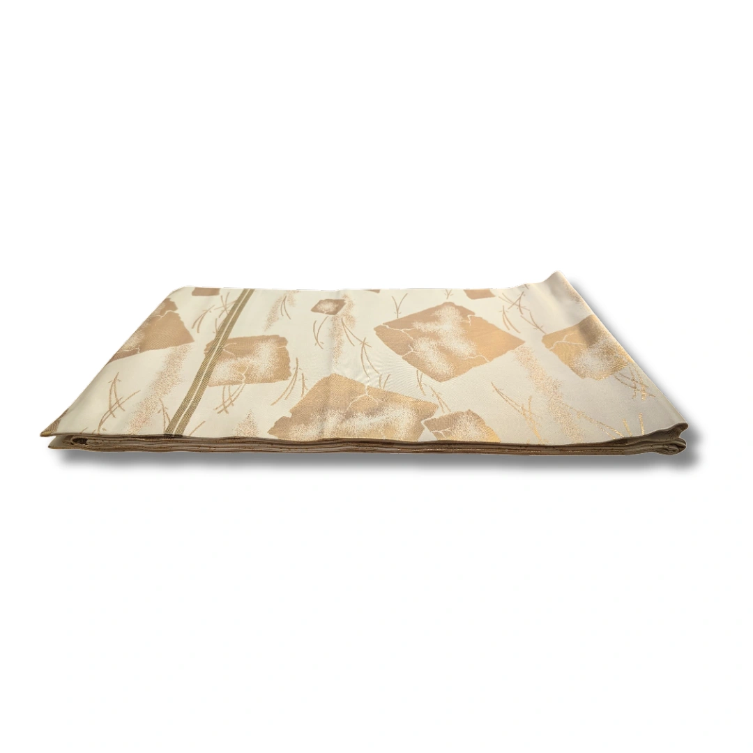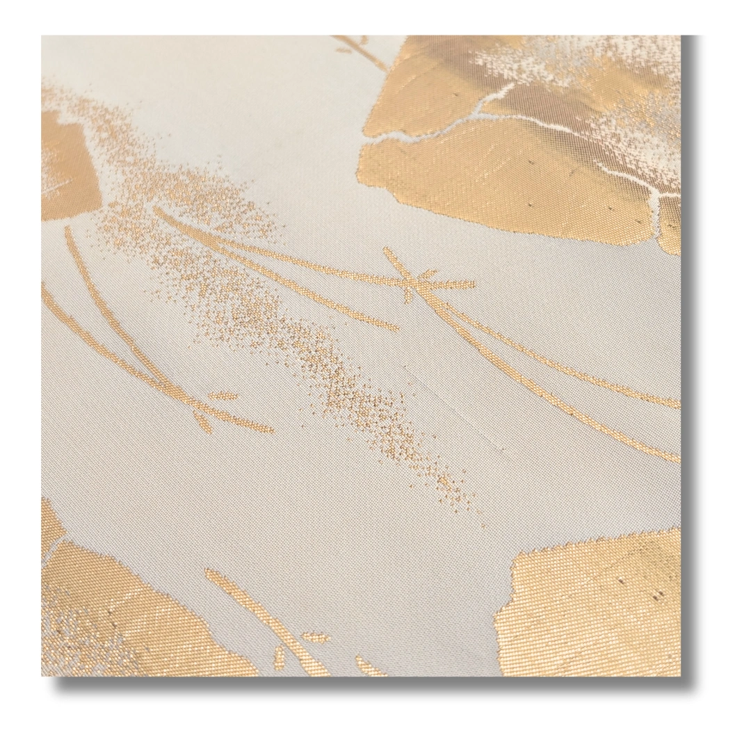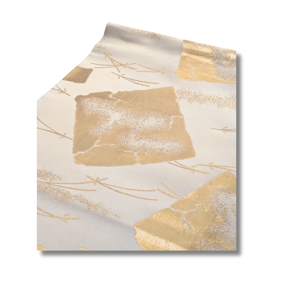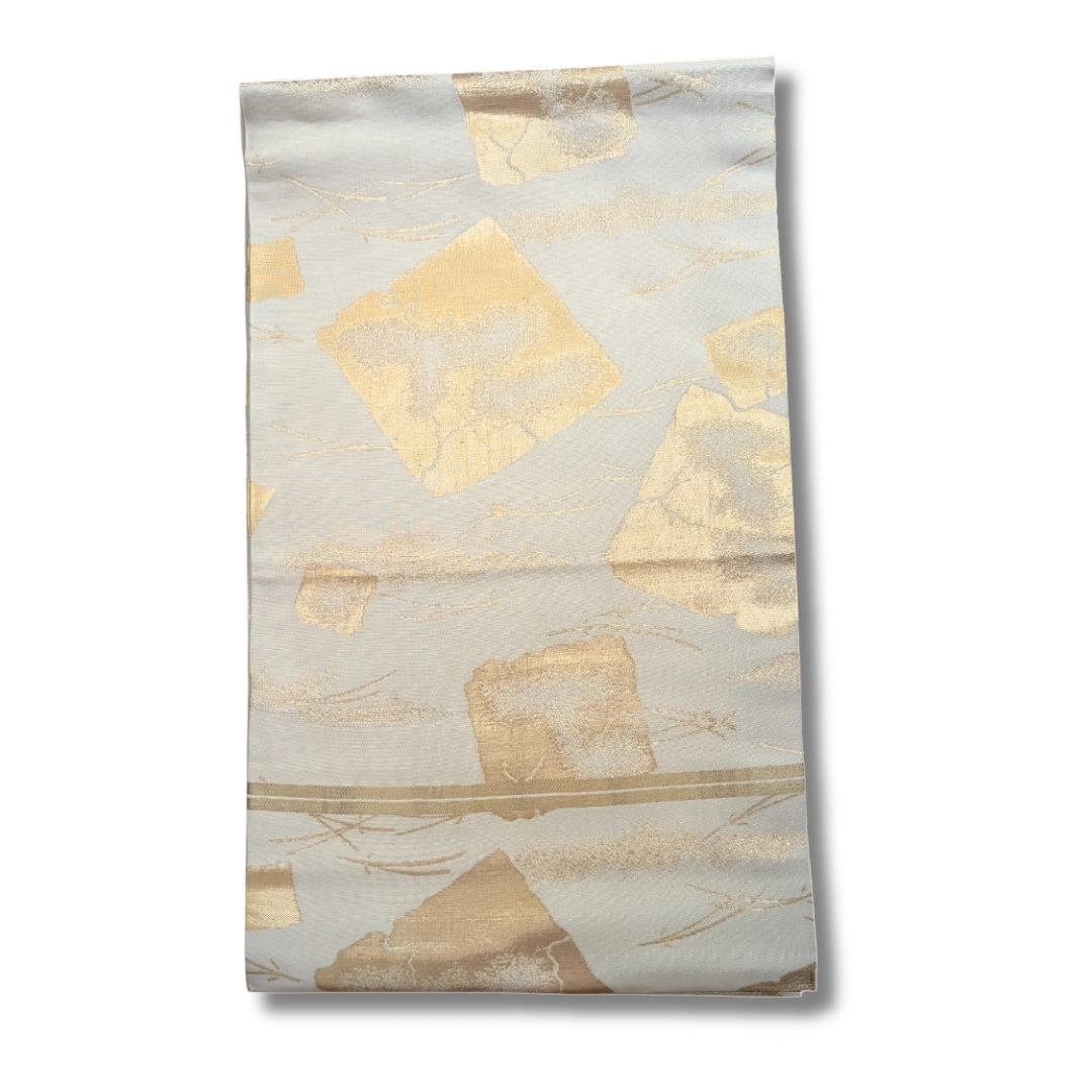 Dieser elegante Maru Obi zeigt ein edles, traditionelles Design in sanften Cremetönen mit opulent schimmernden Goldakzenten. Die unregelmäßig angeordneten goldenen Flächen erinnern an handgearbeitete Blattgold-Dekorationen und verleihen dem Obi eine luxuriöse Ausstrahlung. Feine, angedeutete Linienmuster im Hintergrund erzeugen zusätzlich Tiefe und Struktur.