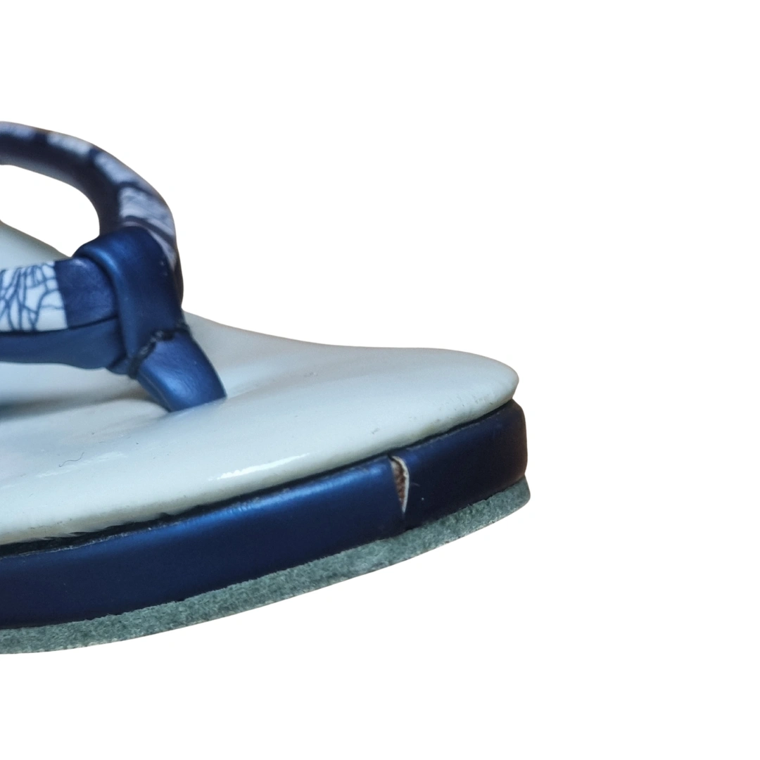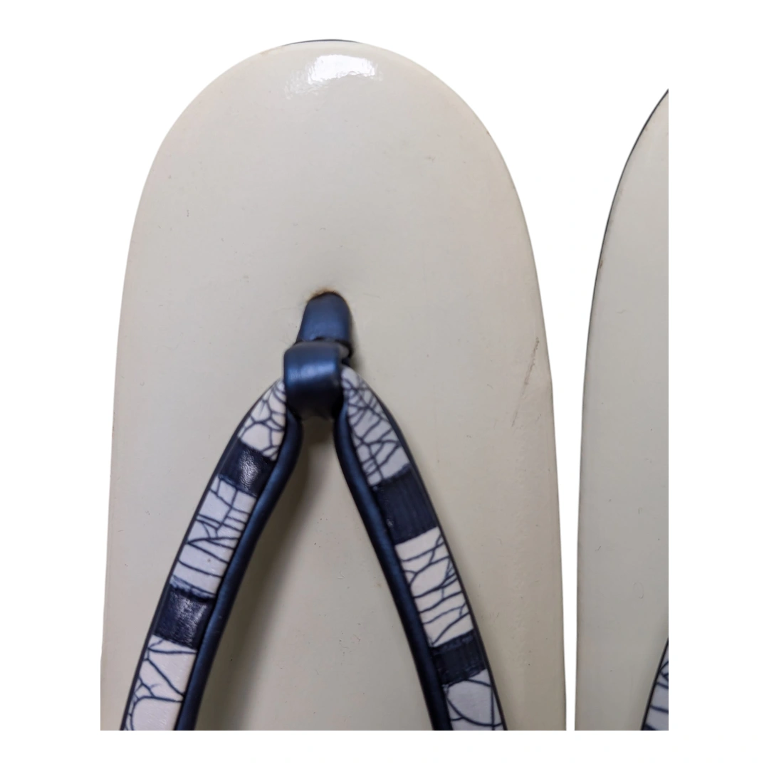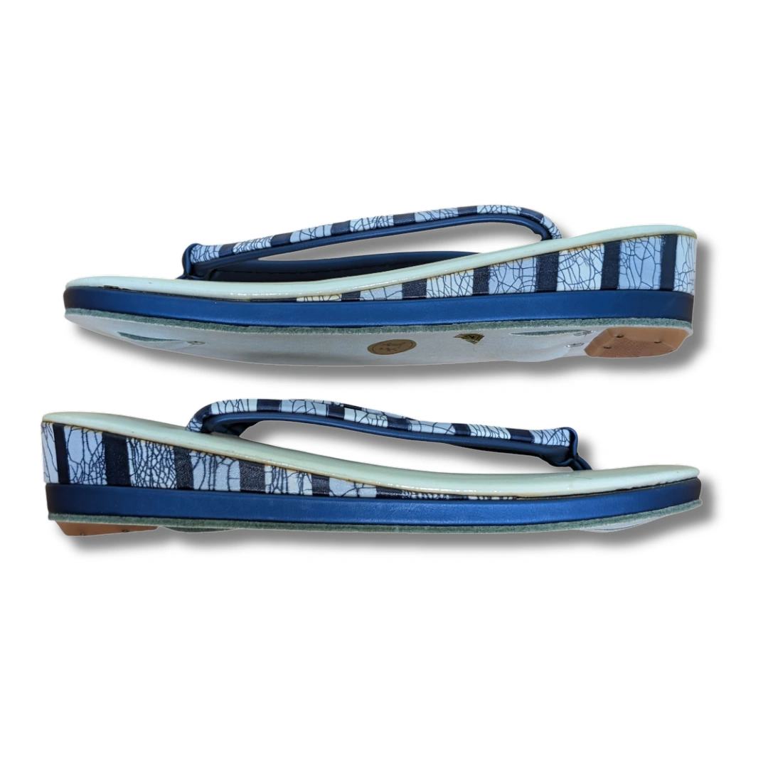Zori Schuhe in Weiß mit Blauen Bändern und einer grauen gummierten Sohle mit Keilabsatz.