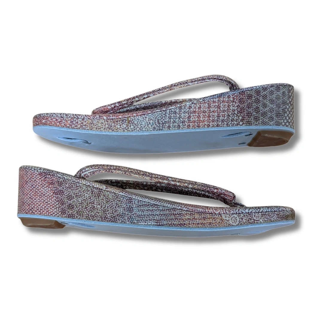 Diese eleganten Zori für Damen verbinden traditionelles japanisches Design mit stilvoller Farbgebung. Die Oberfläche zeigt ein feines, mehrfarbiges Muster in Rot-, Beige- und Violetttönen – inspiriert von klassischen Textilien. Die leicht gepolsterten Riemen sorgen für angenehmen Tragekomfort, während der dezente Absatz für eine elegante Silhouette sorgt.