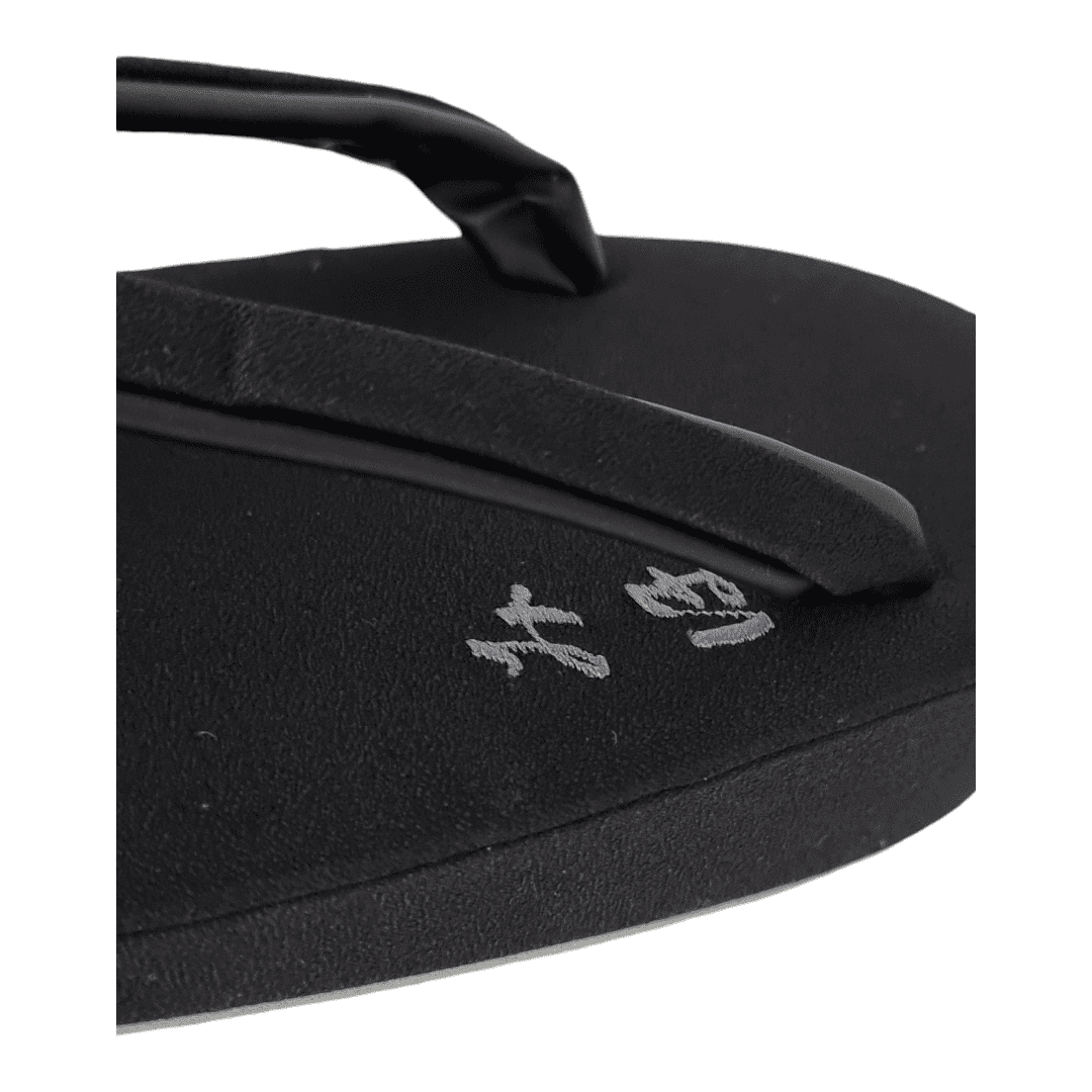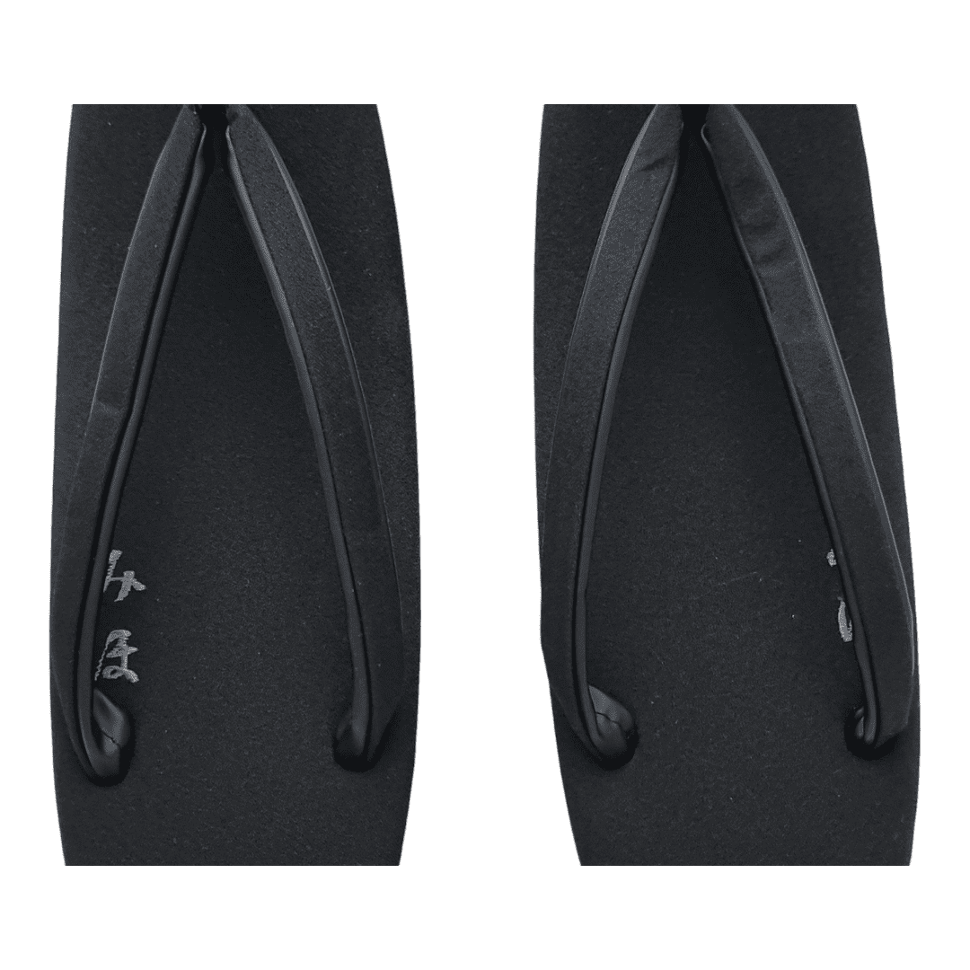 Schwarze Zori Schuhe mit aufgenähten grauen Kanji Schriftzeichen und einer grauen gummierten Sohle.