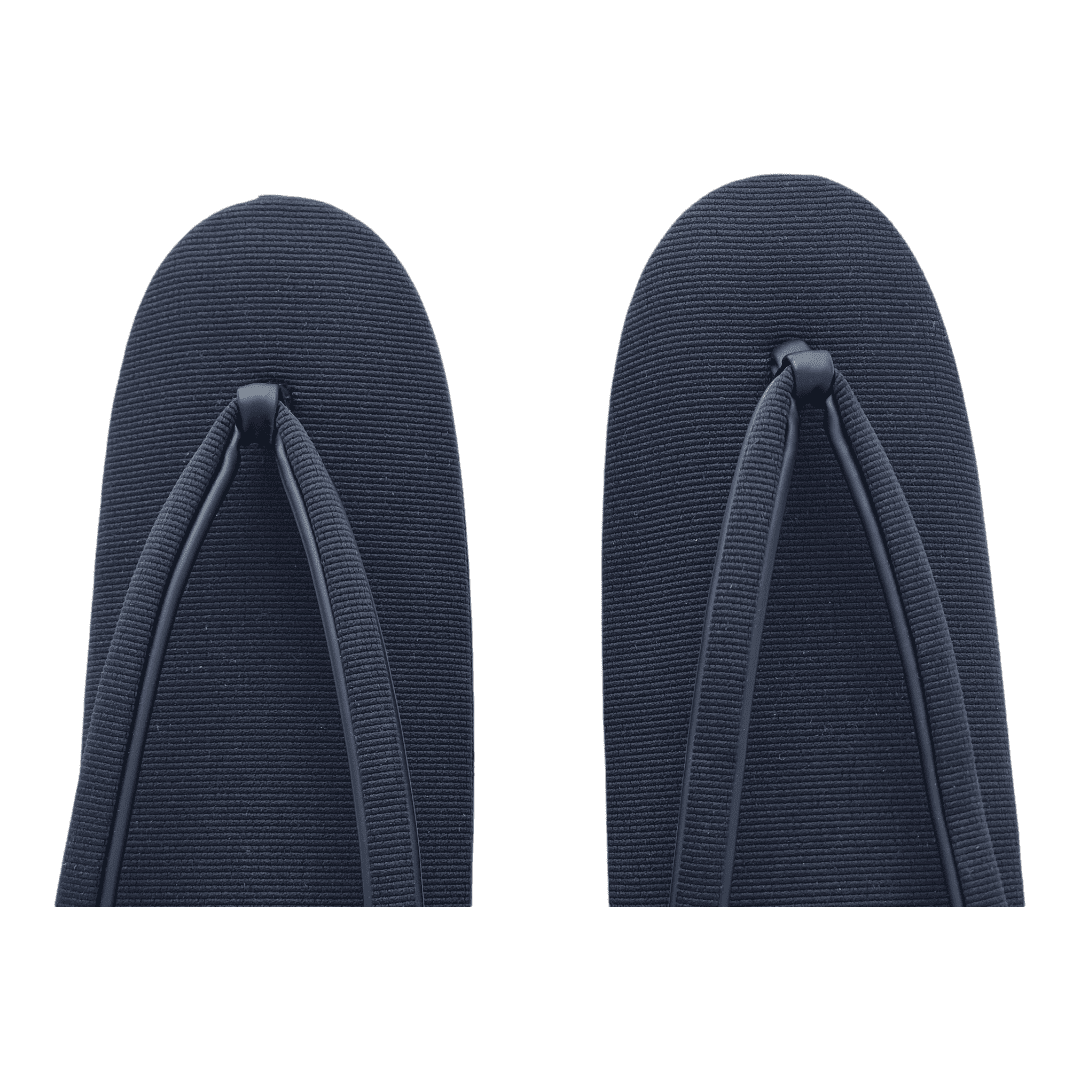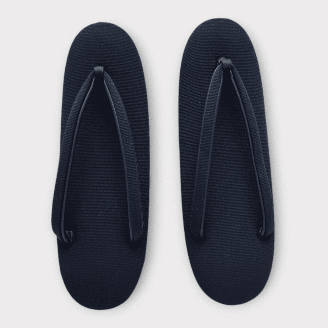 Schwarze Zori Schuhe mit einer grauen gummierten Sohle.