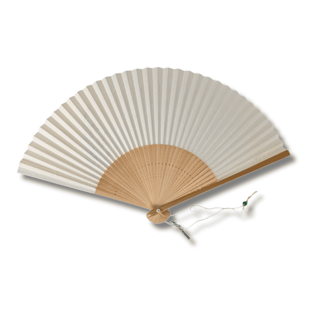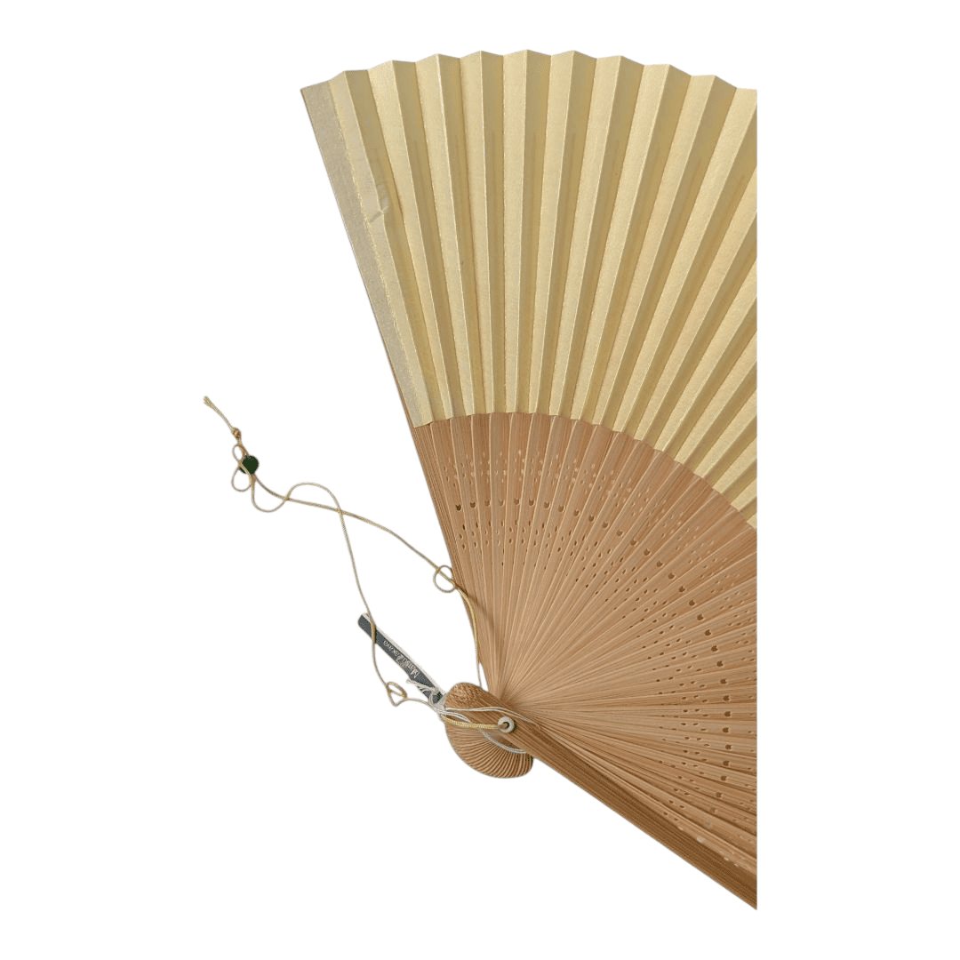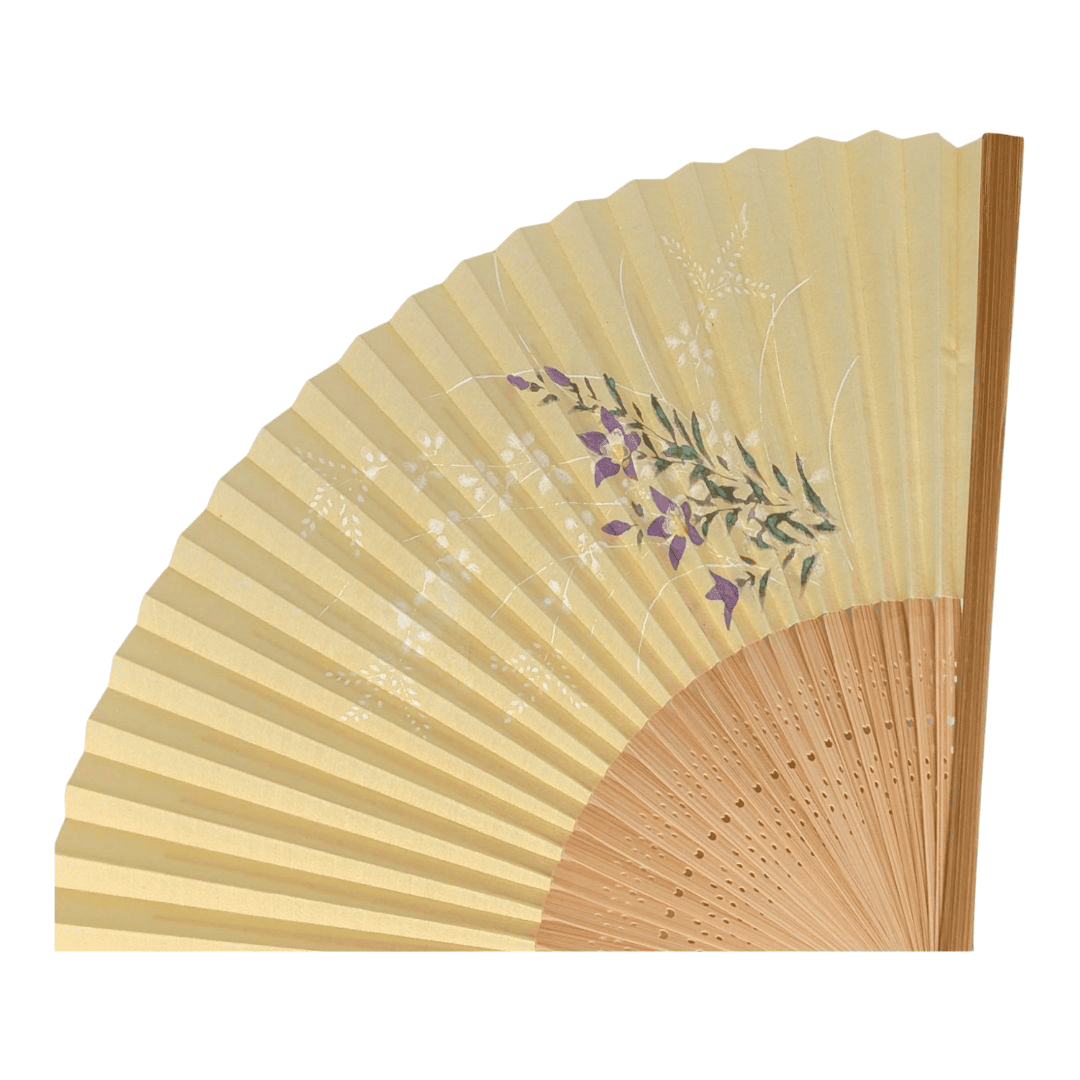 Ein eleganter Sensu-Fächer aus Japan, der durch sein dezentes Design und seine natürliche Farbgebung besticht. Die Vorderseite zeigt ein zartes Blumenmotiv mit violetten Blüten und feinen Gräsern auf einem hellgelben Hintergrund – ein Symbol für stille Schönheit und Vergänglichkeit. Die Rückseite ist schlicht in Weiß gehalten. Die Bambusstreben sind fein gearbeitet und mit filigranen Perforationen versehen.