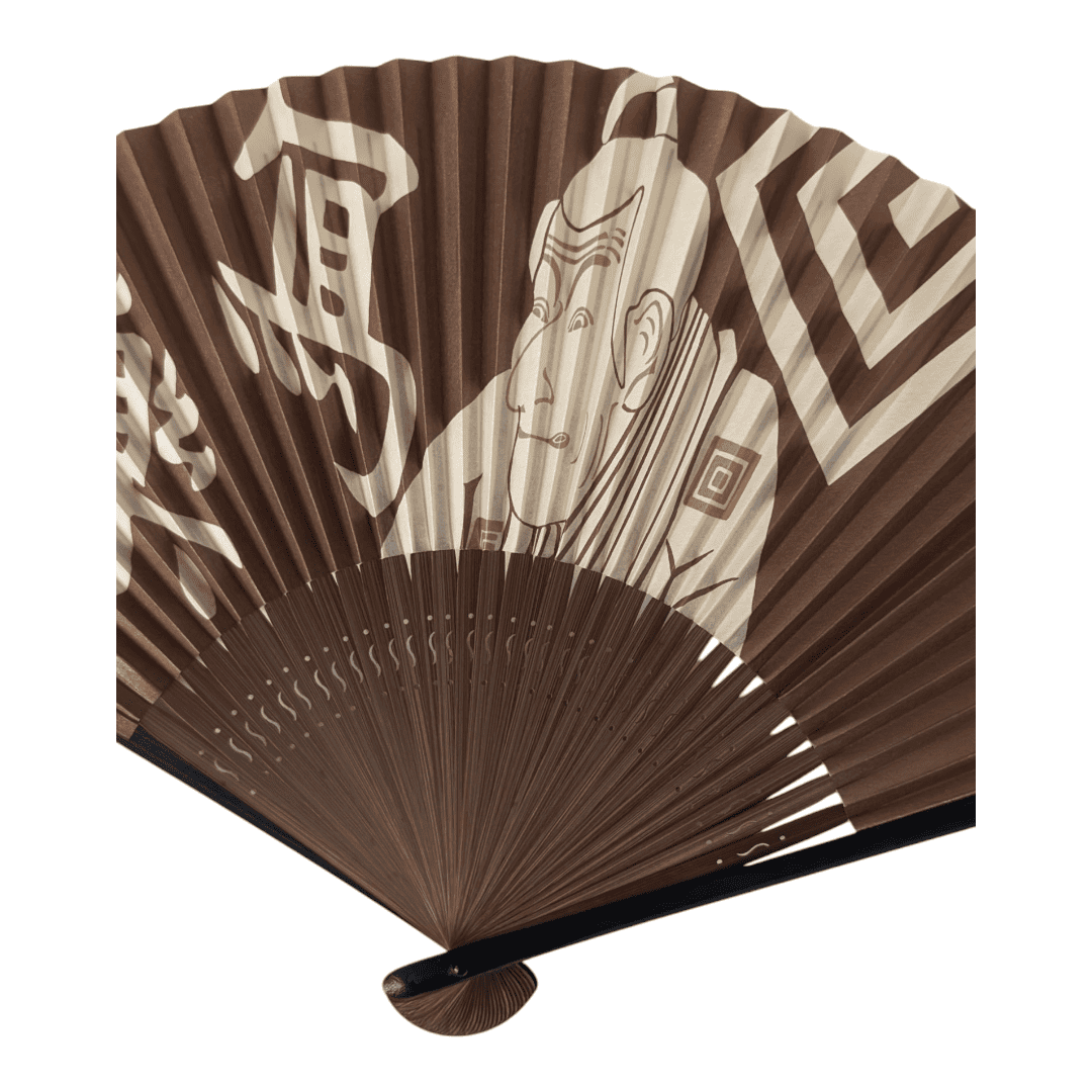 Dieser Sensu aus Japan ist ein echter Blickfang: Die Vorderseite ziert ein traditionelles Kabuki-Porträt samt japanischer Schriftzeichen in sepiafarbenem Vintage-Look – elegant, ausdrucksstark und mit einem Hauch Theatergeschichte. Die Rückseite bleibt schlicht in Naturtönen und bietet so einen stilvollen Kontrast.