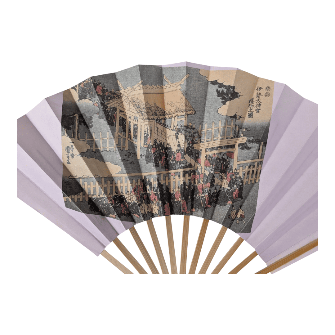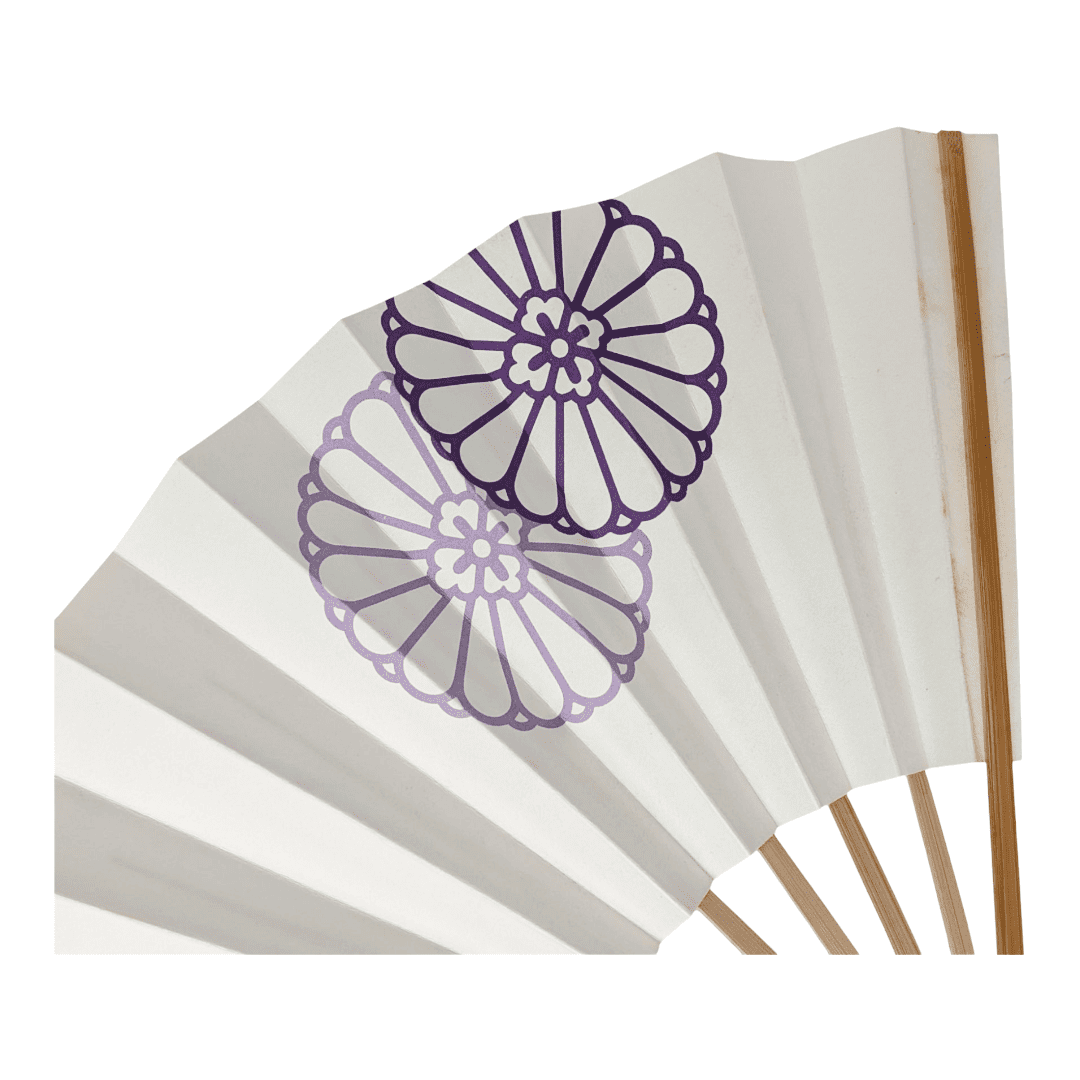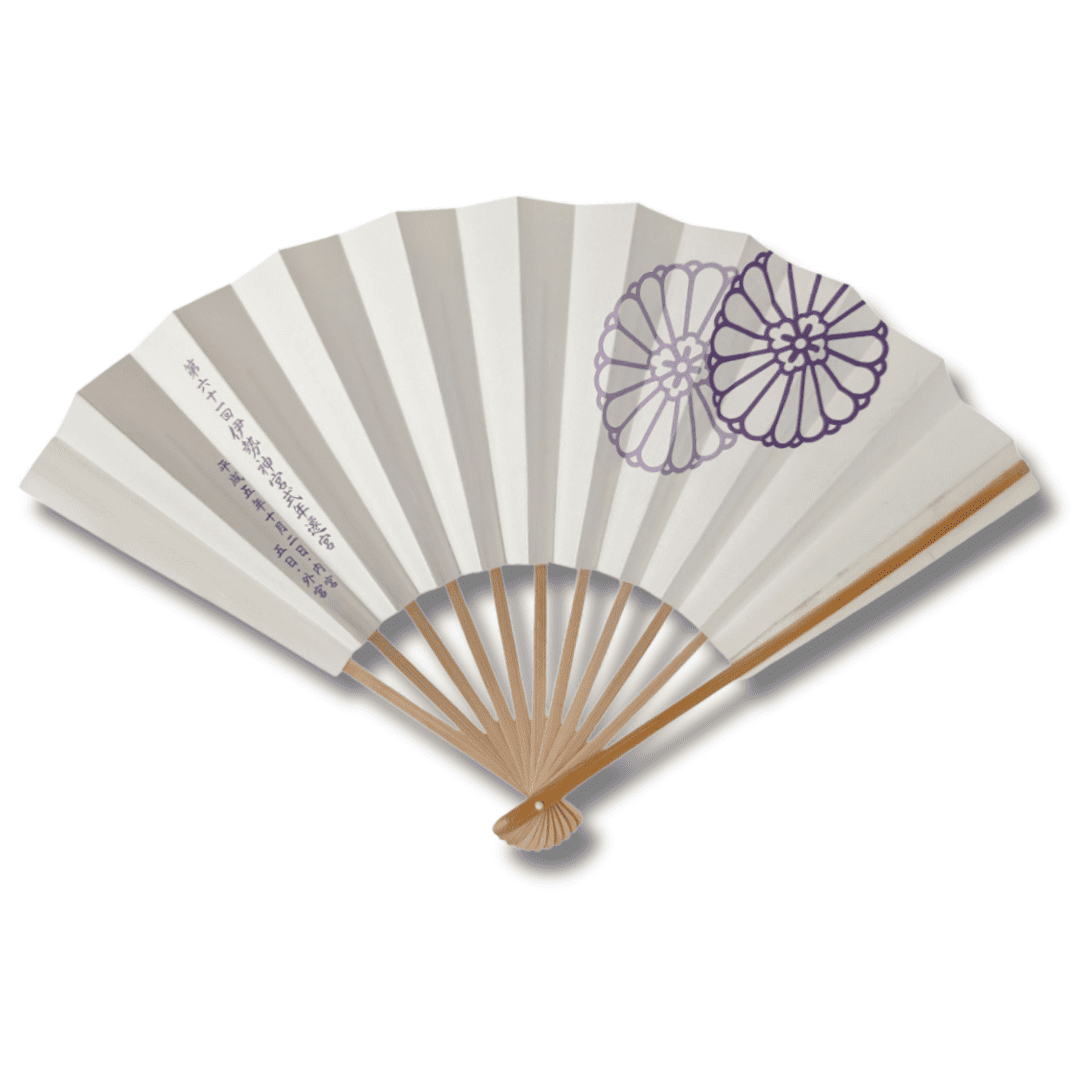 Dieser kunstvolle Sensu-Fächer zeigt ein klassisches Ukiyo-e-Motiv in sanften Beige- und Grautönen auf einem lavendelfarbenen Hintergrund. Die Szene wirkt wie eine historische Darstellung eines Festes oder Tempels und verleiht dem Fächer eine traditionelle und elegante Aura. Die Rückseite vereint Minimalismus und Bedeutung: Zwei Chrysanthemen – Symbol der kaiserlichen Familie Japans – zieren den Fächer, ergänzt durch kalligrafische Schriftzeichen. Perfekt als Dekoration oder stilvolles Accessoire für Liebhaber japanischer Kultur.