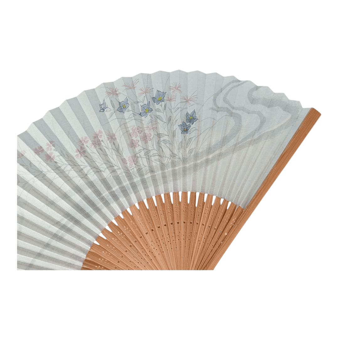 Dieser japanische Fächer besticht durch sein sanftes, fast transparentes Design auf cremeweißem Papier. Auf der Vorderseite ist eine zarte florale Komposition aus pinken und blauen Blüten zu sehen, die sich entlang eines angedeuteten Wasserlaufs ausbreiten. Die feine Pinselführung und die zurückhaltende Farbwahl verleihen dem Motiv eine besonders poetische Note.