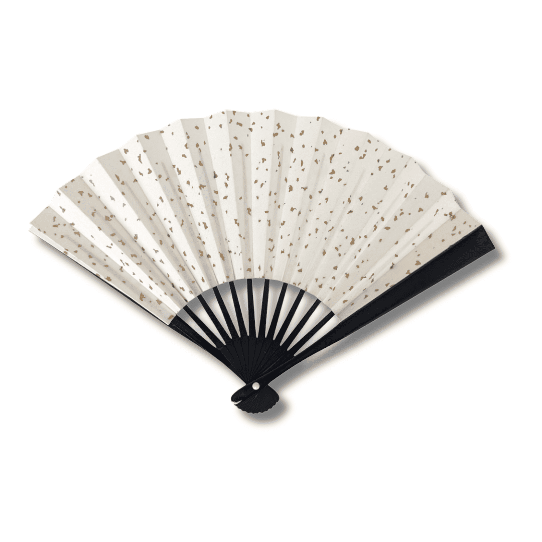 Der Fächer ist beidseitig gestaltet – die Rückseite ziert dezentes Washi-Papier mit goldenen Sprenkeln. Die Kombination aus Gold, Schwarz und feinen Illustrationen macht ihn zu einem echten Blickfang – ob als Deko, Geschenk oder stilvolles Accessoire für besondere Anlässe.