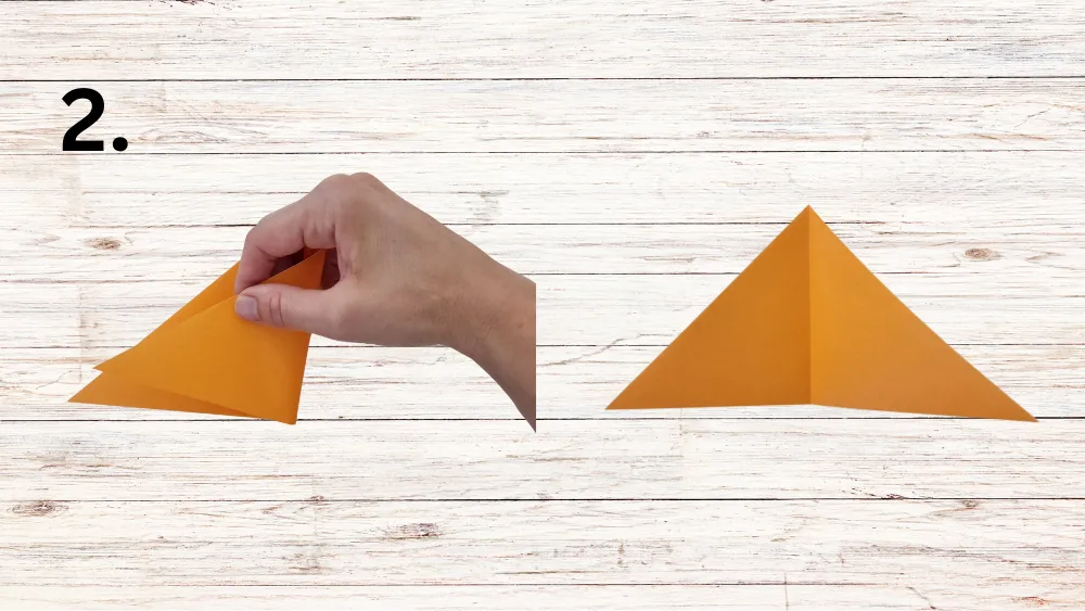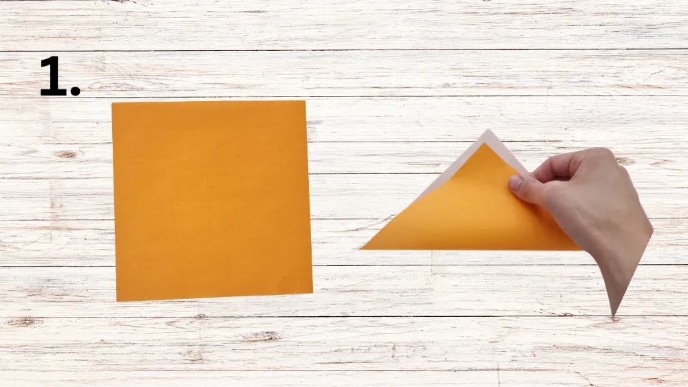 Lege ein quadratisches Blatt Papier auf eine ebene Fläche vor Dich. Falte eine Spitze des Blatts zur gegenüberliegenden Spitze, sodass ein großes Dreieck entsteht.