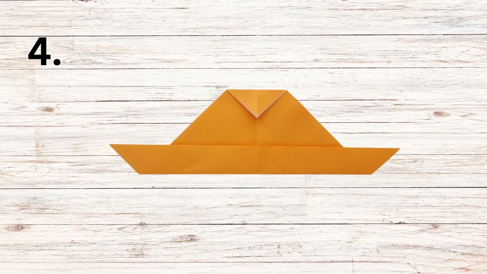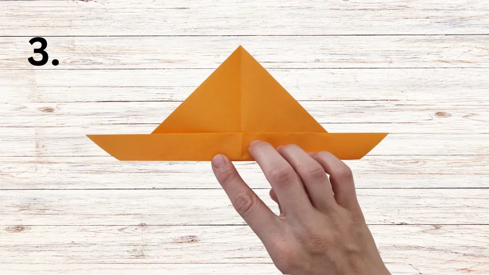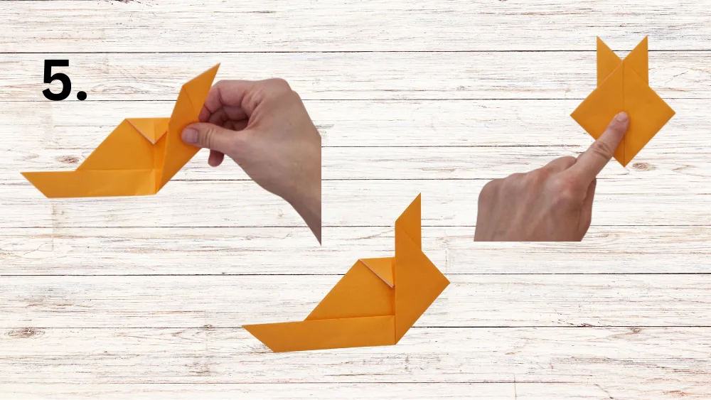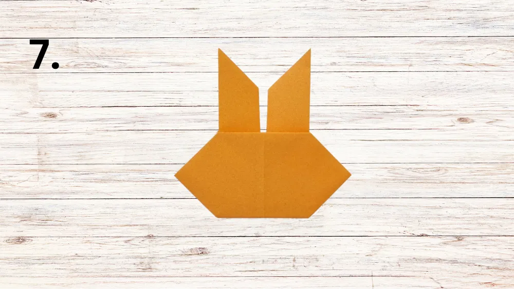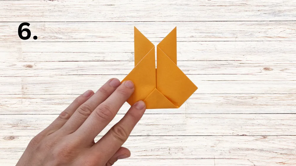 Falte die rechte Spitze des Dreiecks entlang der Mittellinie nach oben, sodass die erste „Hasenohren“-Form entsteht. Wiederhole diesen Schritt mit der linken Spitze, um das zweite Ohr zu formen.
