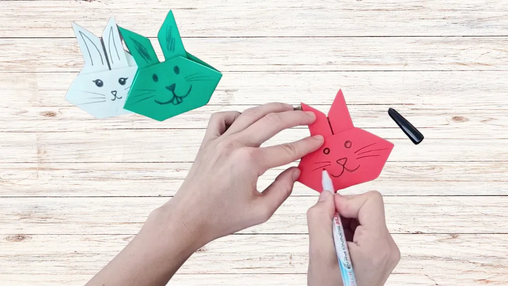 Wende den Origami Hasen und male ein lustiges oder süßes Gesicht auf den Hasenkopf. Du kannst Augen, Nase und Schnurrhaare hinzufügen, um ihn lebendiger zu gestalten.